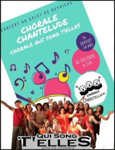 Dimanche 2 Fevrier Posted on 26 janvier 202027 janvier 2020 by Marie Hélène Un concert au Galet La chorale CHANTELUDE reçoit LES QUI SONG t ELLES dimanche 2 février à 15h 5 € l’entrée (gratuit pour les moins...