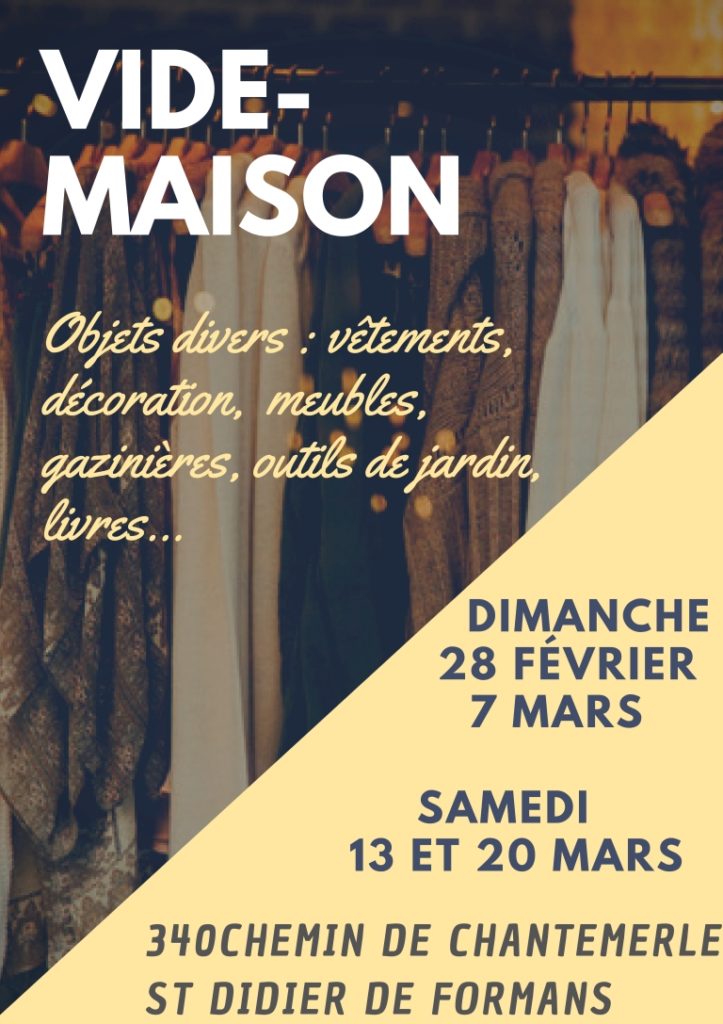 vide maison à Saint Didier de Formans Posted on 24 février 2021 by Marie Hélène Un vide-maison est organisé les dimanche 28 février et 7 mars, et les samedis 13 et 20 mars, de 9h à 12h30 à Saint Didier...