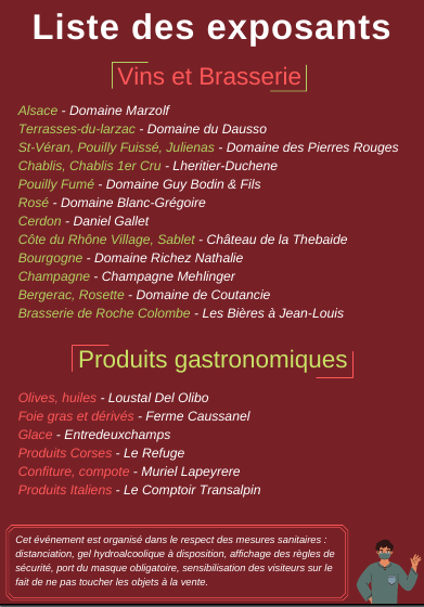 Vous trouverez en ci-dessous le détail de la manifestation et des producteurs de vins et produits du terroir que vous pourrez déguster sur place.