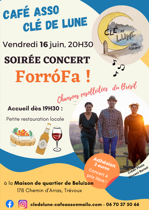 Concert Clé de Lune Posted on 8 juin 20238 juin 2023 by fred Notre prochain concert arrive très prochainement, le 16 juin, avec un groupe brésilien, FORROFA parfait aussi pour danser et nous donner le sourire.Nous vous informons...