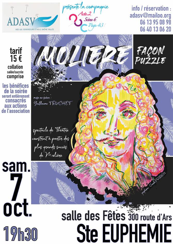 L’ADASV (Aide aux demandeurs d’asile Saône Vallée) vous propose le spectacle « Molière façon puzzle » samedi 7 octobre prochain à 19h30, à la salle polyvalente de Sainte Euphémie.info / réservation :...