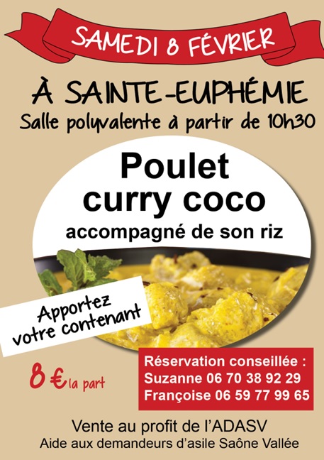 « Poulet curry coco et son riz » vente au profit de l’ADASV le samedi 8 février à partir de 10 h 30 à la salle polyvalente de STE Euphémie