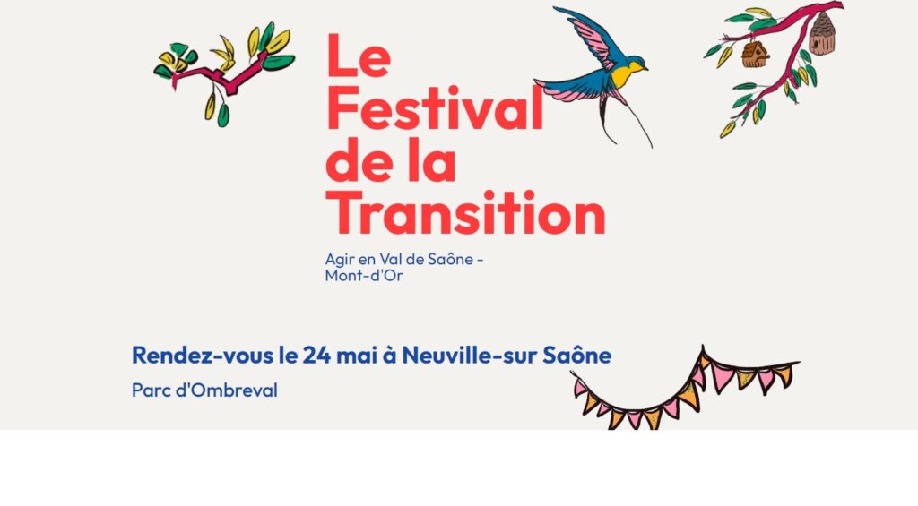 Samedi 24 mai aura lieu à Neuville sur Saône le Festival de la Transition, avec une cinquantaine d’exposants, des balades, des conférences, de la musique....